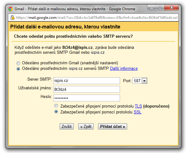 5. V nastavení odesílání pošty vyplňte server ispis.cz, jako přihlašovací jméno uveďte <ID-Vaší-datové-schránky>, zvolte port 465 a zadejte heslo.
